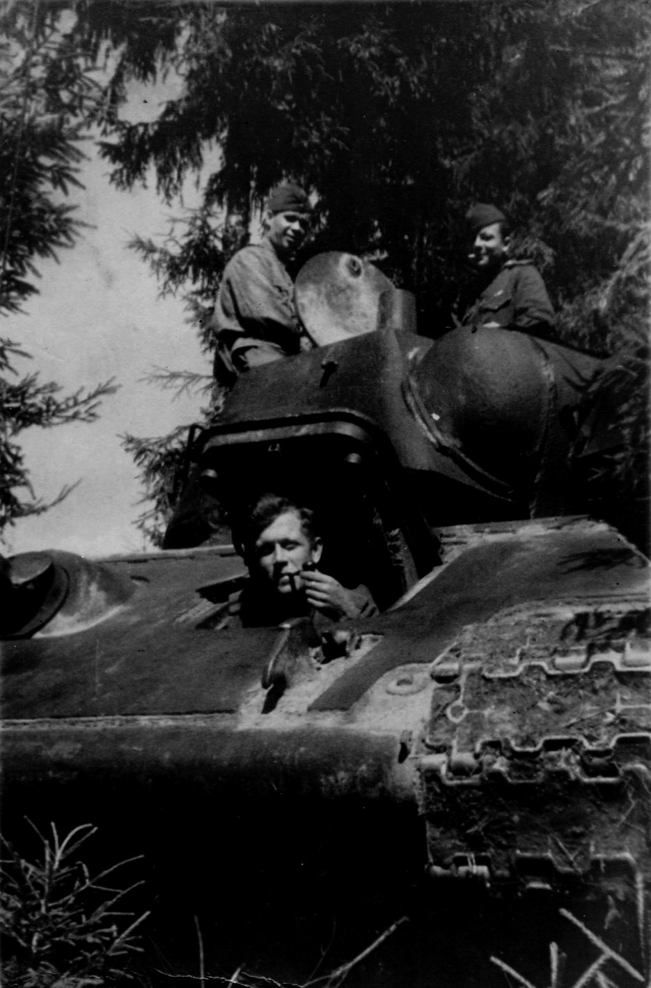 Взобрался по броне на башню. Опускаясь внутрь ее, схватился рукой за открытую крышку люка. Почувствовал между пальцами что-то бархатистое, будто живое. Смотрю и глазам не верю: из-за скобы на люке выглядывает маленький букетик светло-голубых цветов — местного вида фиалок. Обрадовался и удивился: чудом не смял своей грубой пятерней нежные цветочки; и кто это напоминает мне о ручейке под Шумом, о цветочном стебельке, который пробился к свету из-под тяжелого, ржавого осколка снаряда, о чудесном дне, вечерних красках, о мягкой заре — виновнице того, что тогда так и несмерклось?.. Осмотрелся. Среди берез мелькнула девичья фигурка. Кажется, Валя Антонова…
