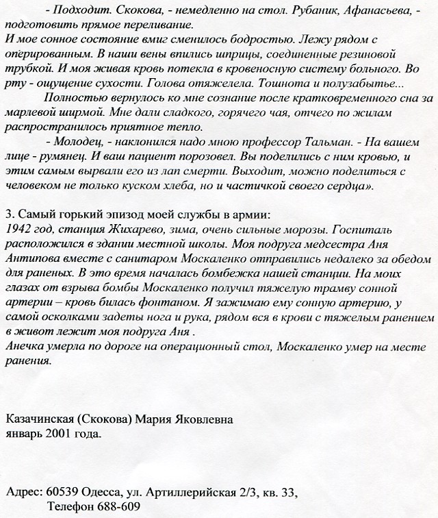 Эпизоды Казачинской (Скоковой) М.Я. военные.